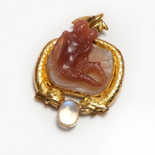 Antique yellow gold high relief carved mermaid and baby agate multi figural griffin with moonstone locket pendant.