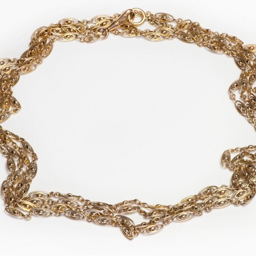 Sautoir necklaces gained popularity in the late 19th and early 20th centuries as fashionable, elongated chains worn alone or adorned with pendants. This piece echoes that tradition, showcasing the timeless craftsmanship and understated opulence that define antique fine jewelry.