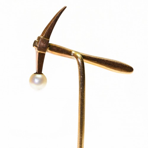 Discover the charm of the past with this unique Antique Gold Mining Pick Hammer Pearl Stick Pin.