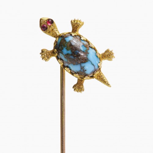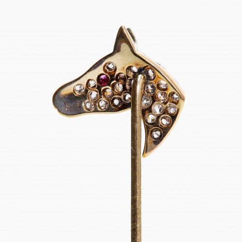 A charming and rare antique stick pin, this piece features a beautifully detailed horse design crafted in a combination of gold and platinum. The horse is elegantly adorned with sparkling diamonds and a rich ruby accent, adding a touch of vibrancy and luxury. This unique stick pin combines fine craftsmanship with an equestrian motif, making it a standout addition to any collection of antique jewelry.
