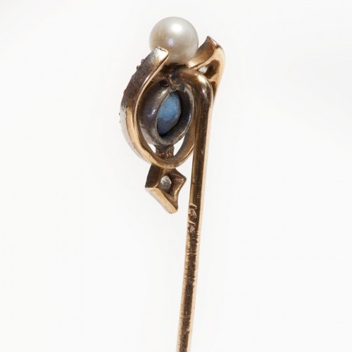 Unveil timeless sophistication with our antique gold and platinum pearl sapphire diamond stick pin.