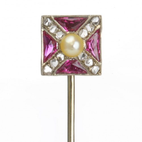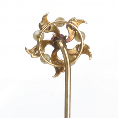 Elevate your accessory game with this antique gold ruby diamond pearl flower stick pin.