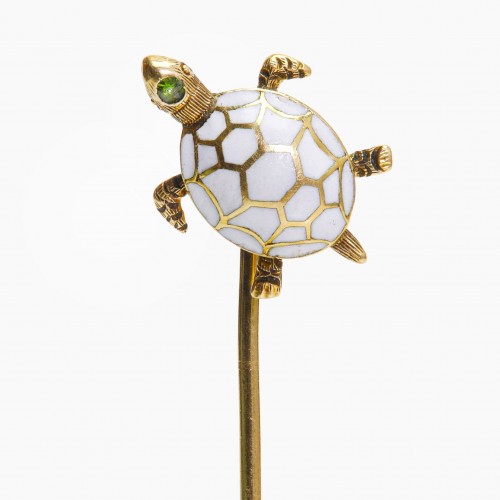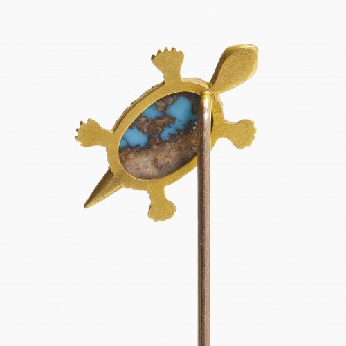 Featuring a finely detailed turtle rendered in warm antique gold, this pin is accented with vibrant turquoise that highlights the turtle’s intricate design. The combination of the rich gold and striking turquoise creates a visually appealing accessory that adds a touch of refined elegance with a playful twist.