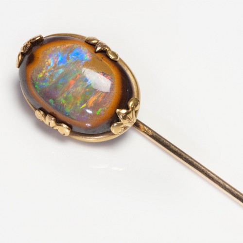 Embrace a unique fusion of natural beauty and craftsmanship with this antique gold wood opal stick pin.