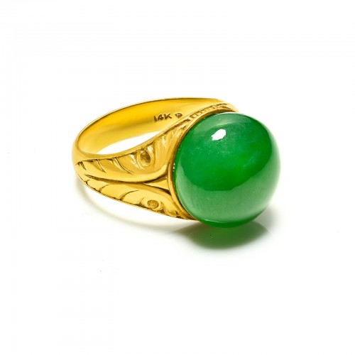 Natural Semi-Round Cabochon Jade Ring in Carved 14K Gold Mount