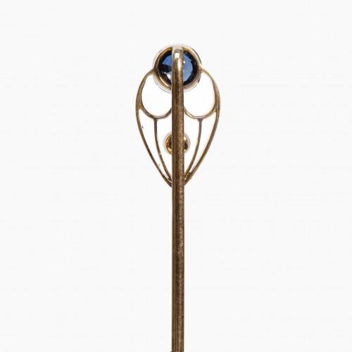 The harmonious combination of sapphire and pearl highlights the pin’s antique charm and timeless allure, making it a distinctive accessory that adds a touch of classic elegance to any attire.