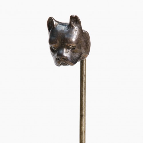 This antique stick pin in platinum and gold is adorned with a stunning sapphire and a lustrous pearl.