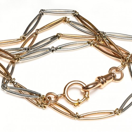 Blending the prestige of platinum with the warmth of gold in a sophisticated chain design. Originating from an era of unparalleled craftsmanship, this necklace exudes a vintage charm that complements any attire. Ideal for collectors and fashion aficionados alike, it serves as a versatile accessory or a unique gift.