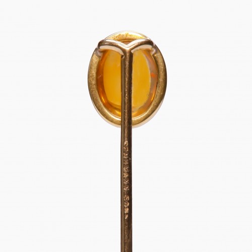 The antique Schumann Sons gold fire opal stick pin features a striking fire opal set in yellow gold.