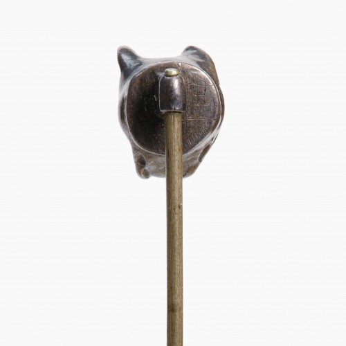 This antique stick pin features a detailed silver dog design.