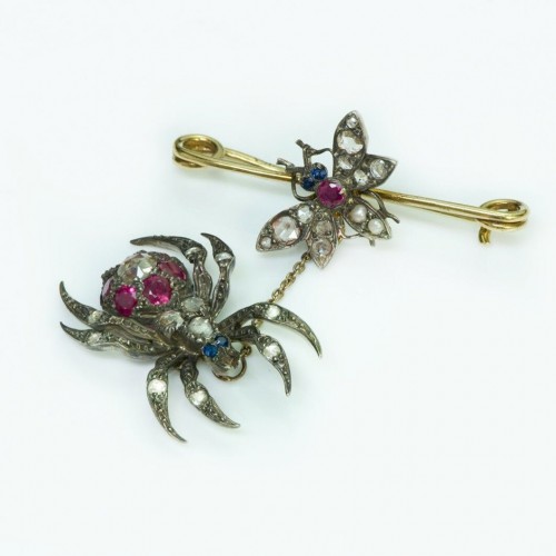 Antique 9K yellow gold spider & fly brooch/pin with chain. With rose-cut diamonds, sapphires, rubies, and pearls. Weight: 5.1 grams. Approximate Measurements 2″ x 1.9.