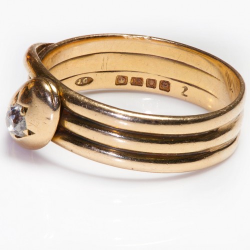 A striking Victorian men’s ring in 18K yellow gold, designed as a coiled serpent adorned with old-cut diamonds—a powerful symbol of eternity and transformation.