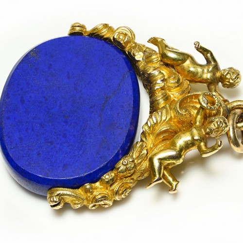 A rare Victorian-era fob crafted in solid 18K gold with elaborate hand-carved cherubs and scrollwork, set atop a vibrant lapis base. A masterpiece of 19th-century gold-smithing.