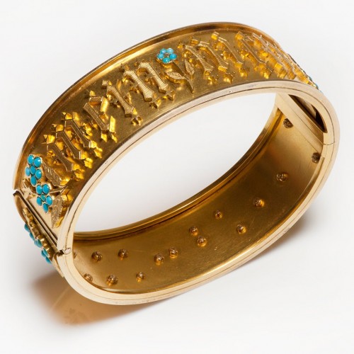 Step into the romance and refinement of the Victorian era with this extraordinary 18K yellow gold bangle bracelet, exquisitely adorned with vibrant turquoise accents. Handcrafted in the 19th century, the bracelet features ornate Gothic-style engraving and delicate turquoise flowers—sentimental motifs that perfectly capture the artistry and symbolism of the period.
