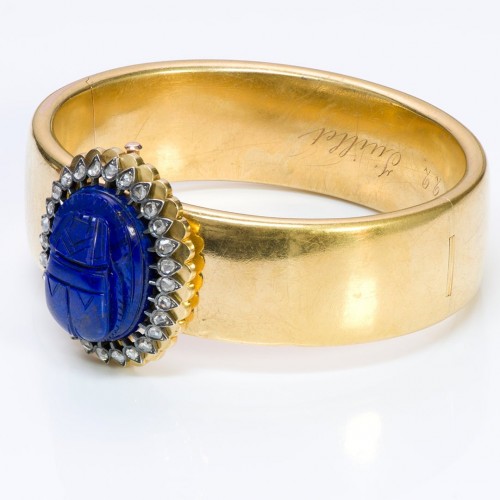 Antique Victorian Egyptian Revival Lapis Scarab Diamond Gold Bangle Bracelet