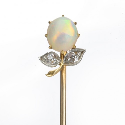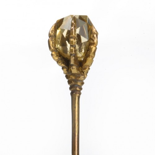 This stunning antique yellow gold stick pin showcases a vibrant citrine gemstone held securely in an intricately designed claw setting.