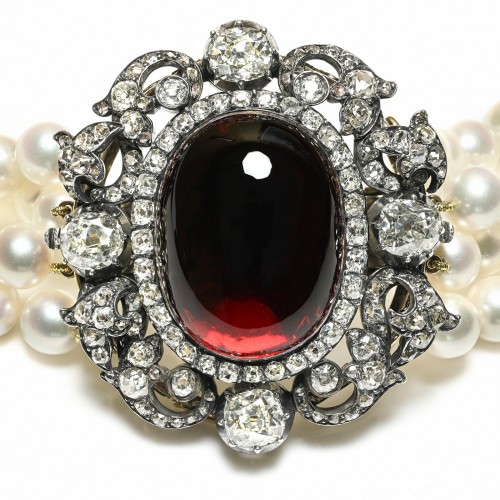 The rich cabochon garnets, with their velvety crimson hue, are thoughtfully arranged to accentuate the soft glow of the pearls, while delicate antique diamonds shimmer with subtle brilliance, adding a layer of sophistication to the piece. Every detail, from the ornate gold work to the precision of the gemstone settings, speaks to the impeccable standards of Victorian fine jewelry.