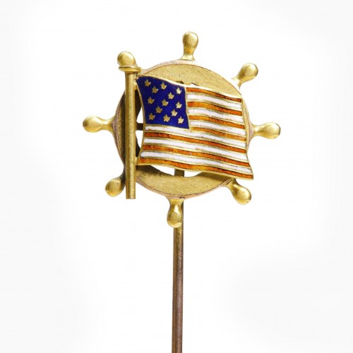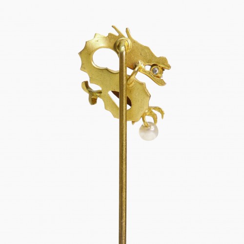 This stunning antique yellow gold stick pin features an intricately designed griffin with a diamond set in its mouth and a lustrous pearl clutched in its claw.