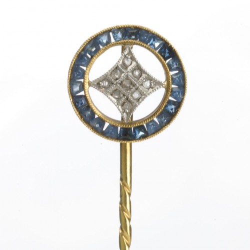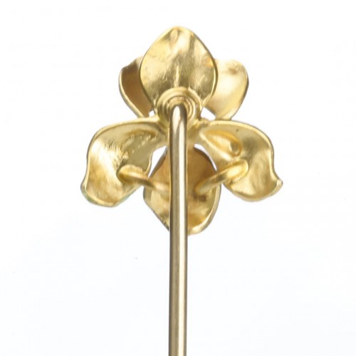 This charming antique yellow gold stick pin features a delicate orchid design, adorned with vibrant enamel and a lustrous pearl at its center.