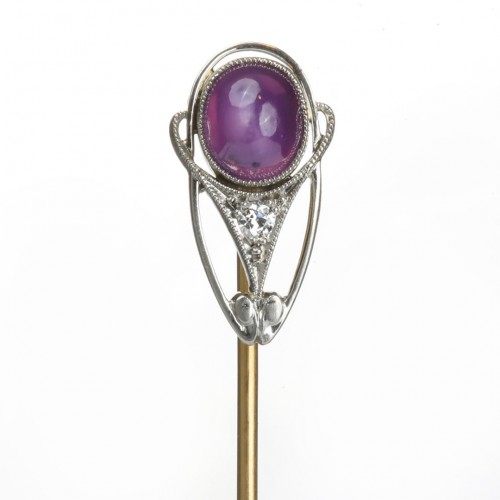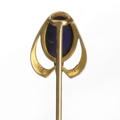 This exquisite antique yellow gold stick pin features a vibrant lapis lazuli centerpiece, beautifully complemented by intricate enamel detailing.