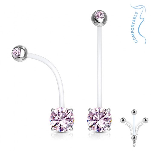 Double Jeweled Prong Set Round CZ Pregnancy Belly Ring. Bioflex with 316L Surgical Steel. Flexible belly rings are comfortable and will work with your growing baby bump. Maternity naval rings are super stylish too! Length is 1″ long. 7mm ball top. 14GA thickness.