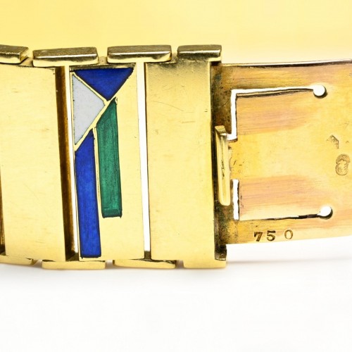 Expertly crafted in 18K gold and adorned with beautiful enamel, this Art Deco French bracelet exudes elegance and sophistication. Add a touch of vintage glamour to your outfit with this one-of-a-kind piece that is sure to become a treasure in your jewelry collection. Bracelet weighs 62.5 grams. 7.35 inches long and is 0.65 inch wide.