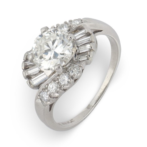 The platinum setting reflects the clean lines and architectural balance emblematic of the Art Deco era, offering a cool, luminous framework that allows the diamond to take center stage. Subtle maker’s marks further attest to the ring’s authenticity and craftsmanship, grounding the piece firmly in its historical context.