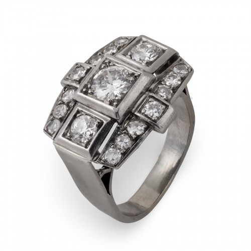 This Art Deco platinum engagement ring showcases a striking round brilliant diamond whose warm antique hue and bold presence capture the romance of early 20th-century design. The center stone is framed by a refined arrangement of single cut diamonds that add a soft, glimmering lift, enhancing the ring’s elegant geometry and vintage character. Sleek platinum lines, subtle architectural detailing, and the balanced proportions of the setting reflect the craftsmanship and stylistic precision of the 1930s. Distinctive, expressive, and full of period charm, this ring offers a captivating blend of history, beauty, and timeless Deco sophistication.