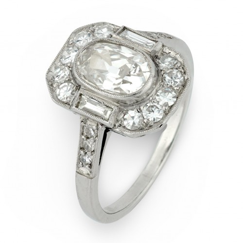 Framing the center stone is a meticulously balanced composition of accent diamonds and sapphires. Fourteen single cut and Old European cut diamonds add subtle brilliance and texture, their soft sparkle enhancing the center diamond without competing for attention. Interspersed among them are fourteen precisely cut French cut blue sapphires, introducing vivid flashes of color and crisp geometry. This interplay of white and blue stones is a hallmark of Art Deco design, creating striking contrast and architectural symmetry.