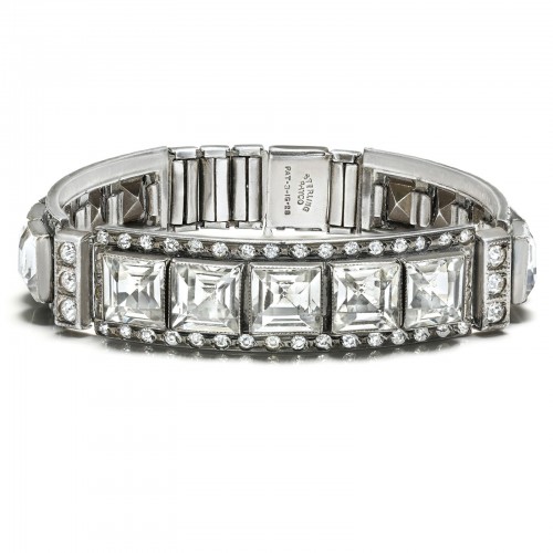 Each bracelet is set with sparkling paste stones—a popular diamond substitute of the era—carefully arranged in linear and angular patterns that reflect the machine-age aesthetics of the 1920s and 1930s. The cool brilliance of the silver setting enhances the play of light across the stones, offering a look of timeless sophistication.