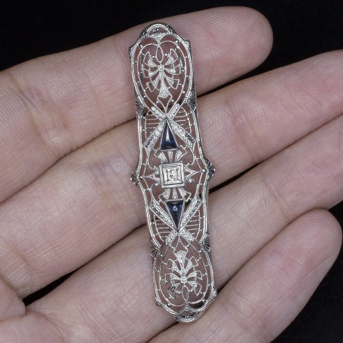 Crafted in the 1930s-1940s, this vintage pendant is a fantastic find with an iconic, Art Deco design, a grillering diamond center and sapphire accents! Finished with intricate filigree and milgrain details hand perfected in solid 14k white gold, this pendant is historied and utterly unique!
