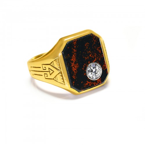 Art Deco 14K Gold Bloodstone and Diamond Men’s Ring – A Statement of Refined Elegance