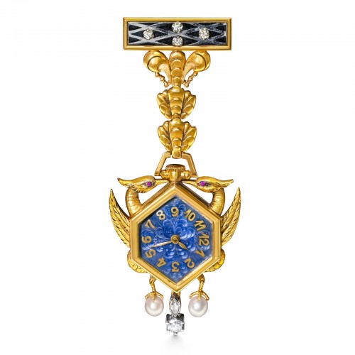 This pendant lapel watch is not only a functional timepiece but also a stunning statement of historical artistry, perfect for those who appreciate both vintage charm and luxurious details.