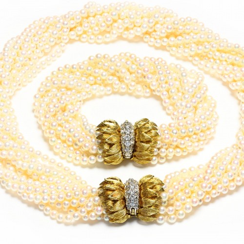 Step into a world where time is adorned with artistry and elegance. This exquisite pendant lapel watch from the Art Nouveau era is a masterful fusion of craftsmanship and opulence. Crafted in 18K gold, the watch features a delicate interplay of diamond accents, rich enamel, and lustrous pearls, all meticulously arranged to create a captivating design.