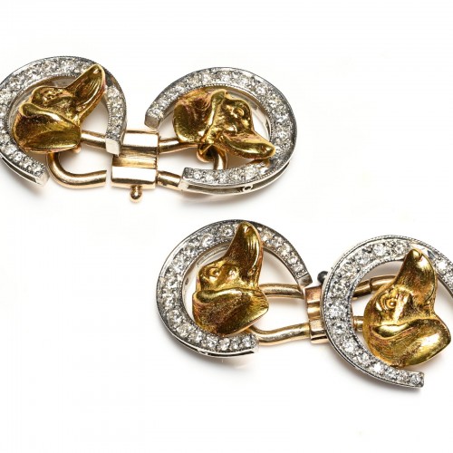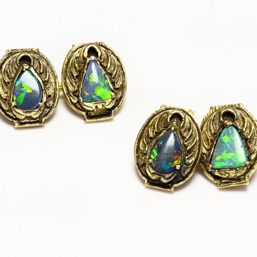 The gold setting of these cufflinks perfectly complements the vibrant black opals, enhancing their natural iridescence. The intricate design showcases the hallmark curves and natural motifs of the Art Nouveau style, making these cufflinks not only a functional accessory but also a piece of wearable art.