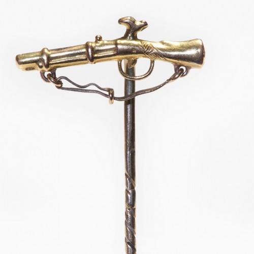 The finely detailed gold work showcases the flowing lines and artistic charm typical of the Art Nouveau style.