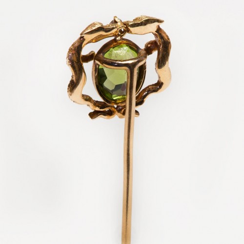 The Art Nouveau peridot diamond dragon griffin stick pin features a striking design with a vibrant peridot nestled between the two majestic mythical creatures, with a small pearl situated between their mouths.