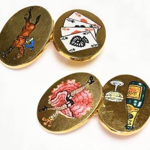 A witty nod to classic indulgences, these Asprey “The Four Vices” cufflinks blend British humor with refined craftsmanship. Meticulously crafted in 18K gold, each cufflink features detailed enamel illustrations representing four traditional gentlemanly vices: gambling, drinking, smoking, and women.
