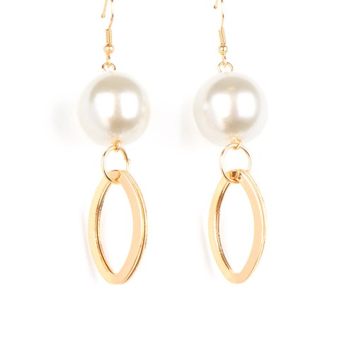 A pair of shiny gold ovals swings from the bottom of an oversized pearl, adding a timeless twist to a traditional lure design. Earring attaches to a standard fishhook fitting.
