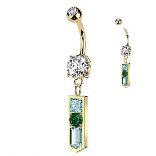 A unique and sexy dangle belly ring featuring mixed light blue and emerald Cubic Zirconia gemstones underneath a solid clear CZ gemstone and small gemstone CZ ball top. The distinctive pointed baguette design truly make this belly ring one-of-a-kind!