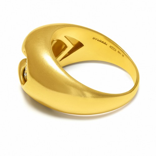 An exquisite expression of love and elegance, this Bulgari Cuore ring is crafted in luminous 18K yellow gold and features a heart-shaped motif adorned with brilliant-cut diamonds. A testament to Bulgari’s timeless design and craftsmanship, this ring is both a statement piece and a cherished collectible for fine jewelry enthusiasts.