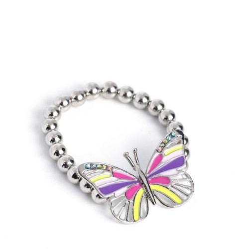 Strung along an elastic stretchy band, a band of sleek silver beads wraps around the wrist. Featured atop the beaded strand, an oversized silver butterfly, with baby pink, Fuchsia Fedora, purple, and Love Bird details is sprinkled with dainty multicolored and iridescent rhinestones across its wings, for a dramatically dazzling finish. Due to its prismatic palette, color may vary.