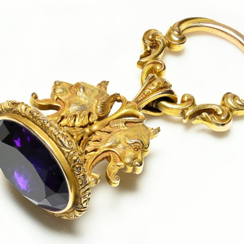 Step into the enchanting world of Art Nouveau with this exquisite gold fob from the renowned Carter Gough & Co. This piece captures the essence of the era with its fluid, organic forms and detailed craftsmanship. At the heart of this majestic fob is a striking amethyst, its deep purple hues radiating an aura of mystery and royalty.