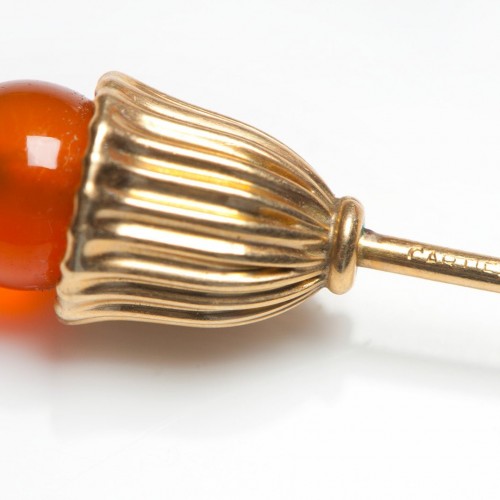 The Cartier gold carnelian stick pin features a rich stone set in a sleek gold frame.