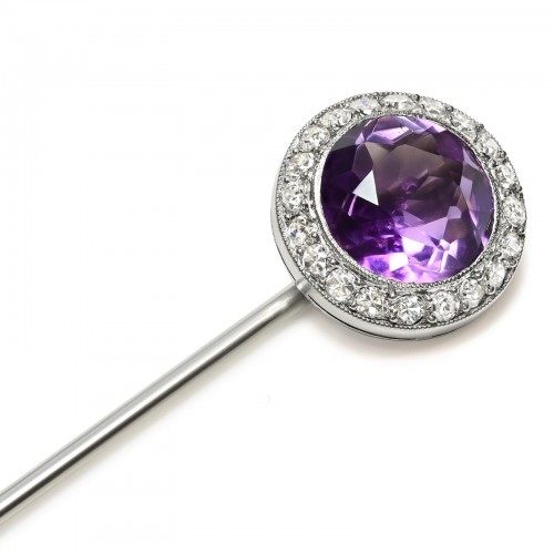 An elegant Cartier London stick pin crafted in platinum, featuring a magnificent round-cut amethyst of rich royal purple hue. The gemstone radiates depth and brilliance, framed by a halo of old European-cut diamonds that enhance its vivid color and refined sparkle.