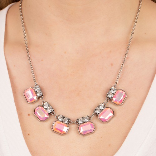 An effervescent collection of bubbly pink pearls and shiny silver beads delicately cluster along the center of an ornate silver chain, creating a classic fringe below the collar. Features an adjustable clasp closure.