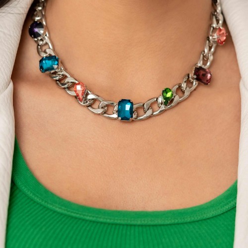 Five various-cut multicolored rhinestones, set in classic shiny silver pronged settings, stack one over the other creating a colorfully industrial lure. Earring attaches to a standard post fitting.