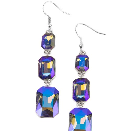 Featuring a dazzling blue and gold UV shimmer, a trio of emerald-cut gems in graduating sizes is linked one below the other for a dramatic red carpet finish. Earring attaches to a standard fishhook fitting.