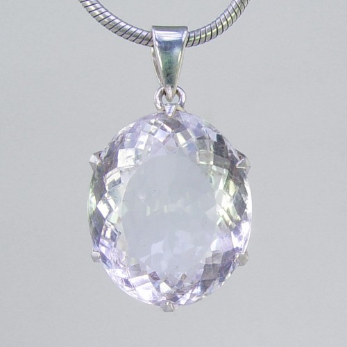 This quartz crystal faceted oval shape stone is set in a sterling silver prong setting. It has a large size sterling silver bail that will take most chains.The quartz crystal faceted oval pendant is 1″ x 5/8″ and weighs about .17 ounces. The 15.9 carat natural crystal stone protrudes through the back of the setting to touch the skin.