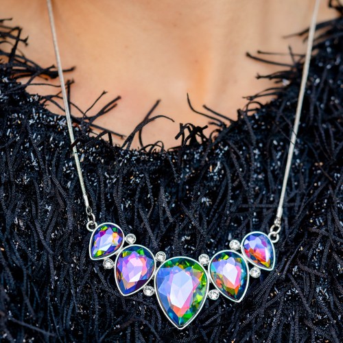 A dazzling collection of oil spill teardrop gems dramatically fan out around three round pieces of hematite, creating an explosion of sparkle. The exaggerated gems circle into a floral centerpiece that sits atop a pair of skinny gunmetal bars that wrap around the wrist in an airy finish. Features a hinged closure.